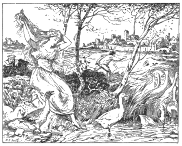 Now the old king happened just then to have nothing else to do; so he amused himself by sitting at his kitchen window, looking at what was going on; and he saw her in the courtyard. As she looked very pretty, and too delicate for a waiting-maid, he went up into the royal chamber to ask the bride who it was she had brought with her, that was thus left standing in the court below. ‘I brought her with me for the sake of her company on the road,’ said she; ‘pray give the girl some work to do, that she may not be idle.’ The old king could not for some time think of any work for her to do; but at last he said, ‘I have a lad who takes care of my geese; she may go and help him.’ Now the name of this lad, that the real bride was to help in watching the king’s geese, was Curdken.